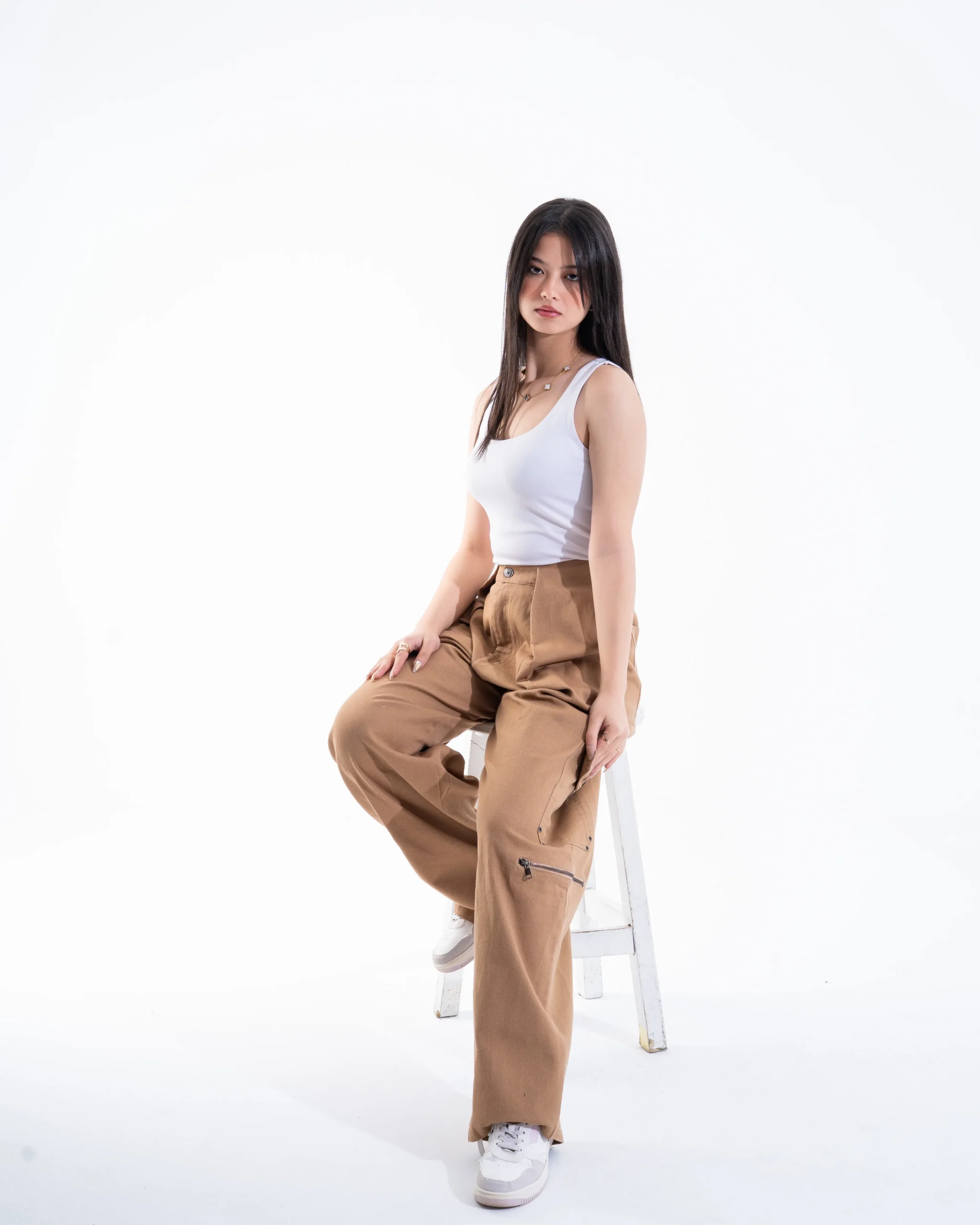 Crafted from high-quality structured fabric, the material offers durability while maintaining a soft, breathable feel suitable for all-day wear. The wide leg cut creates a flattering elongated shape, while the cargo pockets and zipper details add a bold, fashion-forward edge.